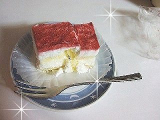 グラタンについで、ケーキそのままの見た目。スポンジ2層とクリーム2層、一番上にジャムという5層構造。普通のケーキのまわりにまいてある透明フィルムもそのまま再現している。